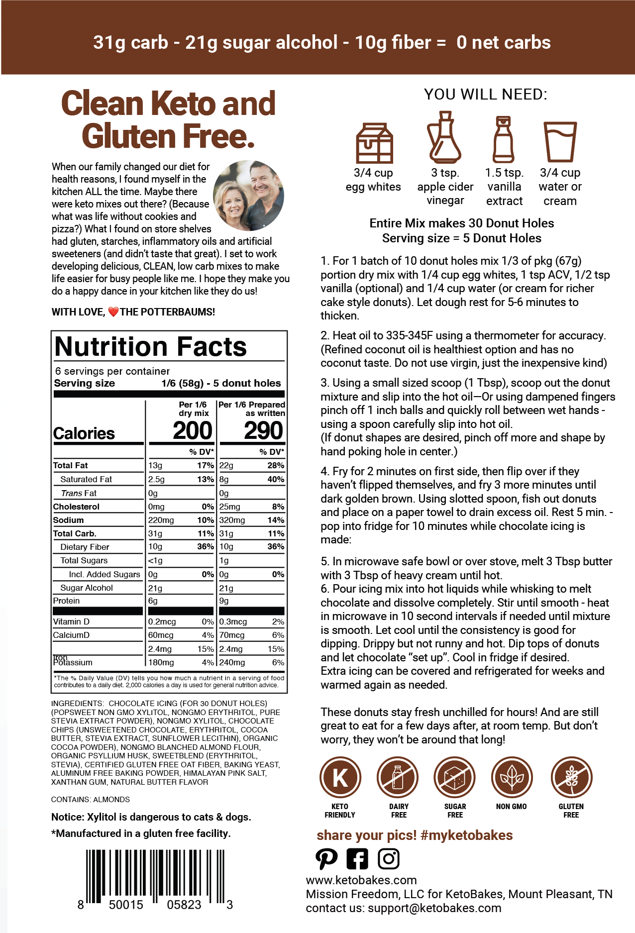 INGREDIENTS: CHOCOLATE ICING PACKET (FOR 30 DONUT HOLES) (NONGMO XYLITOL, NONGMO ERYTHRITOL, PURE STEVIA EXTRACT POWDER, NONGMO XYLITOL, ORGANIC COCOA POWDER), NONGMO BLANCHED ALMOND FLOUR, ORGANIC PSYLLIUM HUSK, NONGMO ERYTHRITOL, CERTIFIED GLUTEN-FREE OAT FIBER, BAKING YEAST, ALUMINUM-FREE BAKING POWDER, HIMALAYAN PINK SALT, XANTHAN GUM, NATURAL BUTTER FLAVOR, PURE STEVIA EXTRACT POWDER