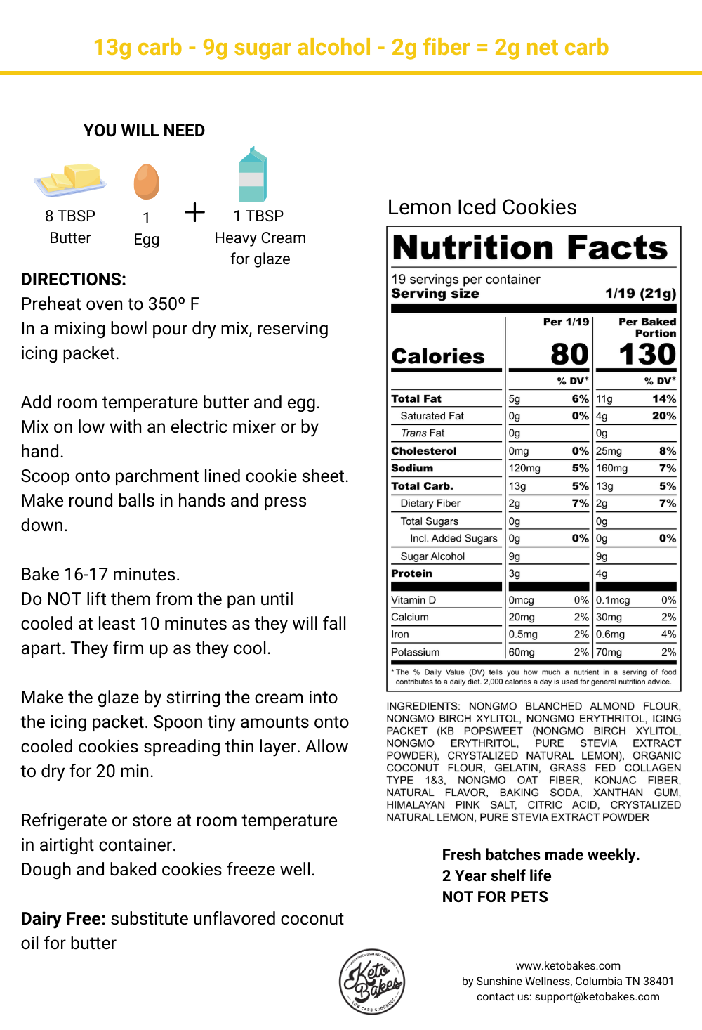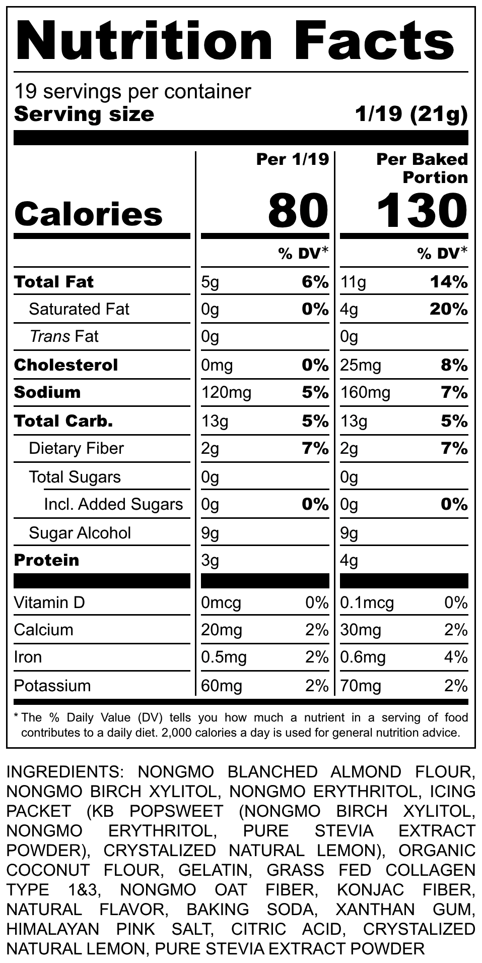 CLEAN INGREDIENTS: NonGMO blanched almond flour, NonGMO Birch Xylitol, NonGMO Erythritol, Icing packet (KB PopSweet (NonGMO Birch Xylitol, NonGMO Erythritol, Pure Stevia Extract Powder), crystalized natural lemon), organic coconut flour, Gelatin, Grass Fed Collagen Type 1&3, NonGMO Oat Fiber, Konjac Fiber, Natural Flavor, Baking Soda, Xanthan Gum, himalayan pink salt, Citric Acid, crystalized natural lemon, Pure Stevia Extract Powder